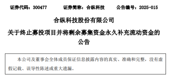 3月7日,合纵科技发布关于终止募投项目并将剩余募集资金永久性补充流动资金的公告。