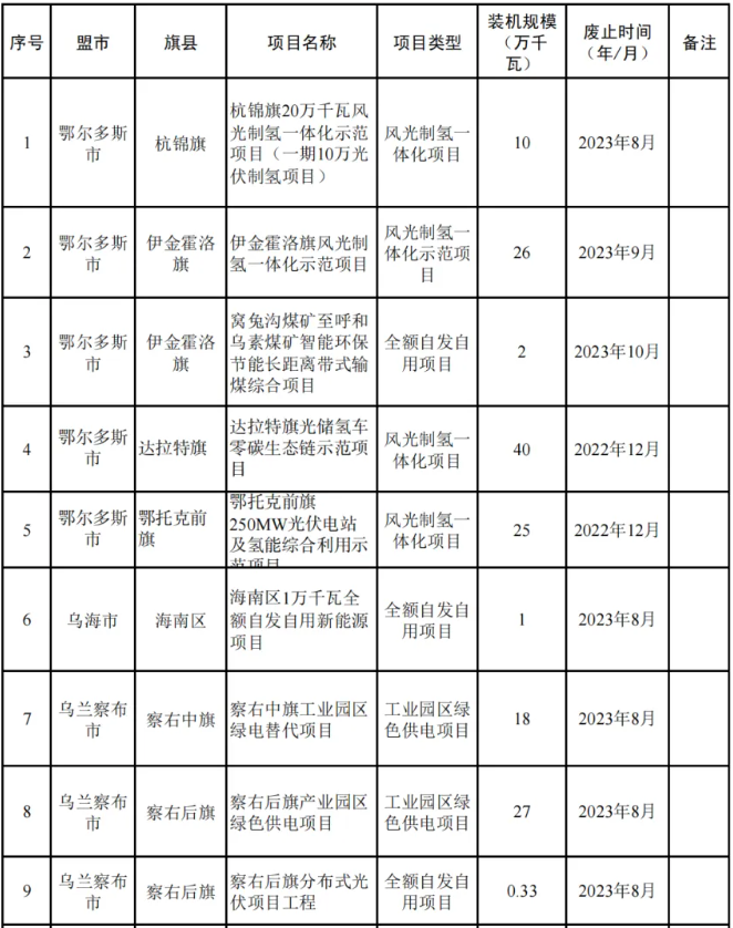 3月10日,据内蒙古太阳能行业协会初步统计,截至目前,自治区能源局公告废止了三批已获批但无法推进实施的市场化并网新能源项目,共37个项目,总规模1265.393万千瓦。其中,废止的风光制氢项目12个,新能源规模631.6万千瓦;全额自发自用项目7个,新能源规模7.093万千瓦;工业园区绿色供电项目14个,新能源规模529.5万千瓦;源网荷储一体化项目2个,新能源规模76万千瓦,燃煤自备电厂可再生能源替代工程项目1个,新能源规模8.5万千瓦;火电灵活性改造消纳新能源项目1个,新能源规模12.6万千瓦。