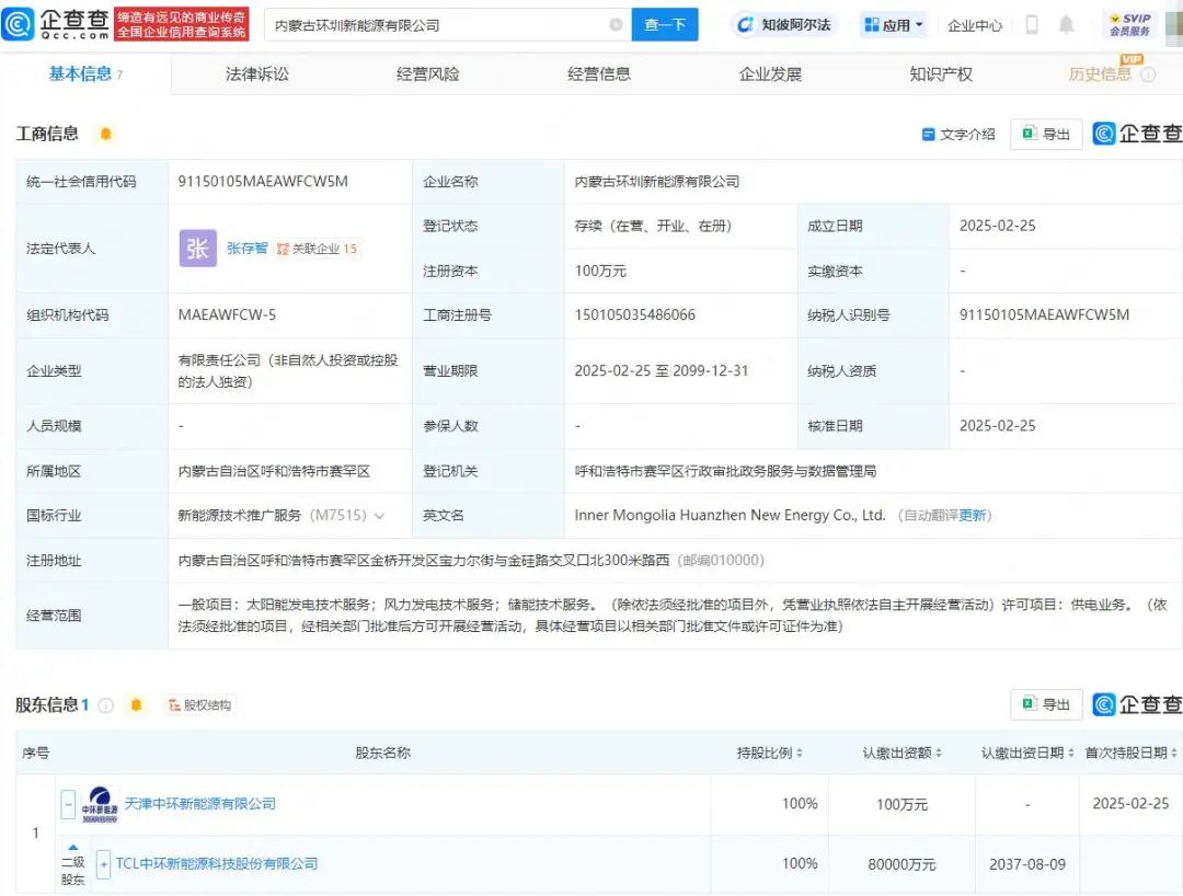 企查查APP显示,近日,内蒙古环圳新能源有限公司成立,法定代表人为张存智,注册资本为100万元,经营范围包含:太阳能发电技术服务;风力发电技术服务;储能技术服务;供电业务。企查查股权穿透显示,该公司由TCL中环间接全资持股。