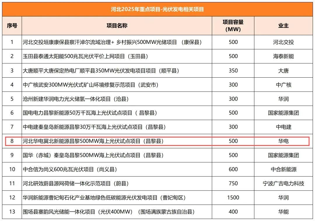 此外,河北华电昌黎500MW海上光伏项目也是河北省2025年省重点建设项目。