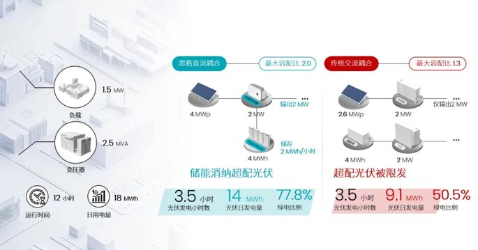 思格新能源创新推出直流耦合架构方案。在同样2 MW逆变器容量的条件下,利用直流耦合架构,容配比可高达2,实现4 MWp光伏装机容量。该方案光伏组件和储能电池直接连接到直流侧,光伏系统运行时可以给电池充电,也可以为负载供电,日发电量提高至14 MWh,企业绿电使用比例跃升至77.8%,大幅减少了企业对电网的依赖程度。