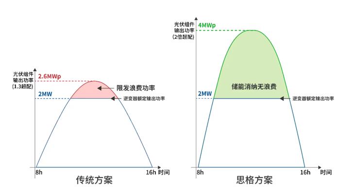 此外,传统交流耦合主动超配,其目标是通过延长逆变器满载工作时间,在增加的组件投入成本和系统发电收益之间寻找平衡点,实现系统平均化度电成本(LCOE)最小。即使在光照不佳的情况下,逆变器也可以满负载工作,从而延长满载工作时间;但系统实际发电量曲线将出现如图所示的“削峰”现象,存在部分时间段内处于限发工作状态,造成资源浪费。