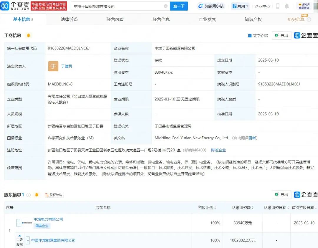 企查查APP显示,近日,中煤于田新能源有限公司成立,法定代表人为于建民,注册资本约为8.39亿元,经营范围包含:输电、供电、受电电力设施的安装、维修和试验;发电业务、输电业务、供(配)电业务;太阳能发电技术服务;新兴能源技术研发等。企查查股权穿透显示,该公司由中国中煤能源集团有限公司间接全资持股。