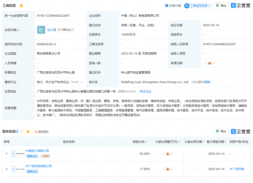 企查查显示,近日,中煤(钟山)新能源有限公司成立,法定代表人为杜兴源,注册资本1.5亿元人民币,经营范围包括发电技术服务、风力发电技术服务、太阳能发电技术服务、生物质能技术服务、储能技术服务等。股东信息显示,该公司由中煤电力有限公司、中广核风电有限公司共同持股。