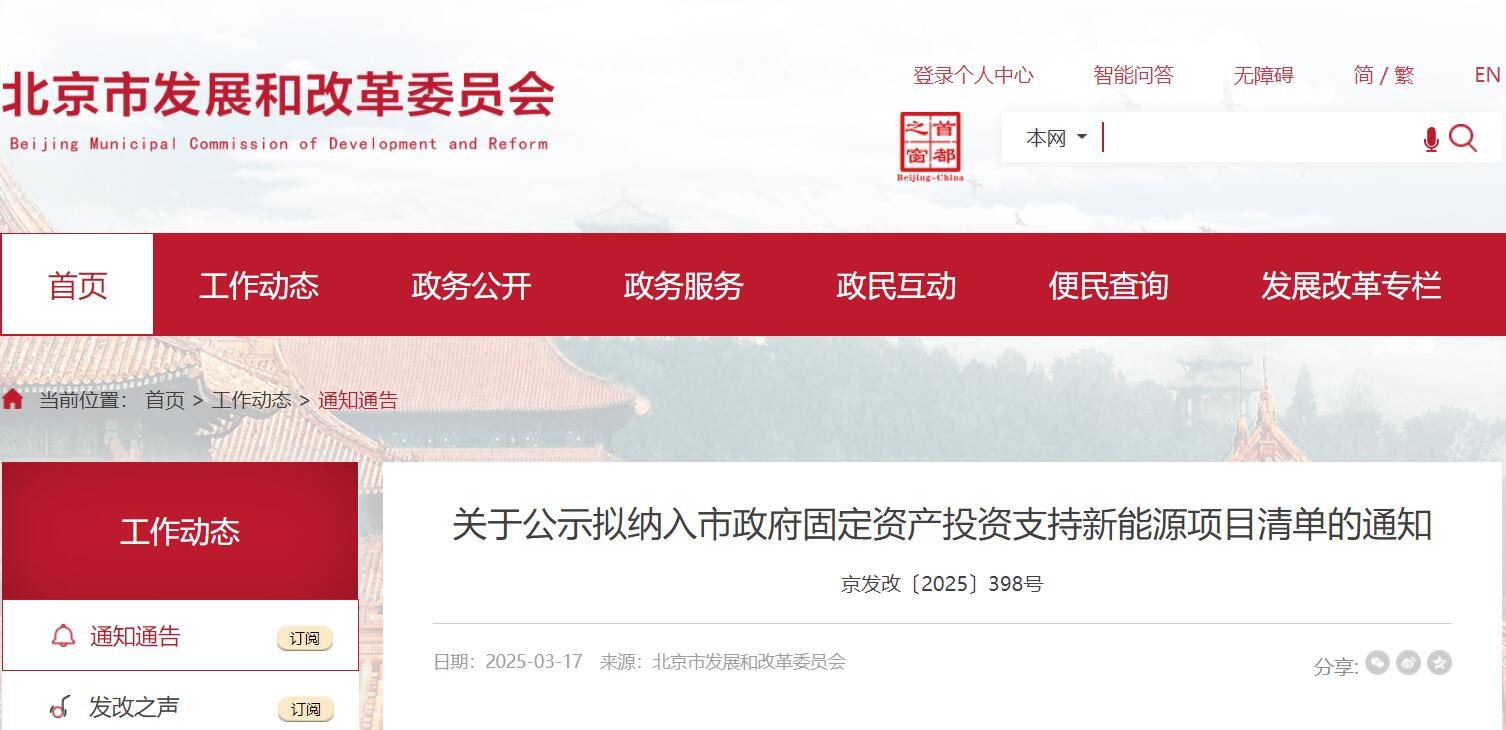 3月17日,北京市发展和改革委员会公示拟纳入市政府固定资产投资支持新能源项目清单的通知。