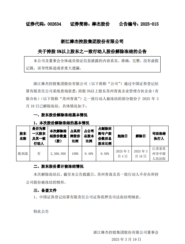 据公告,公司通过中国证券登记结算有限责任公司系统查询得知,苏州青嵩之一致行动人被冻结的部分股份已于2025年3月18日解除冻结。本次解除冻结后,截至公告披露日,苏州青嵩及其一致行动人所持有的棒杰股份已不存在被冻结的情况。