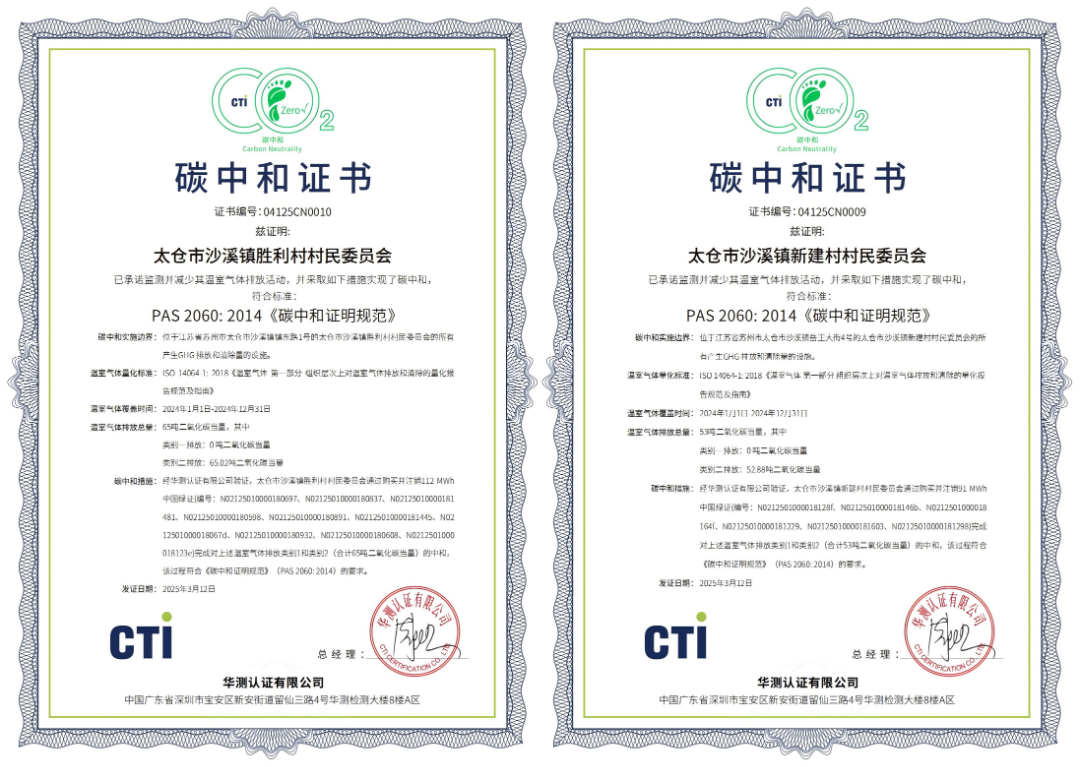 3月18日,在协鑫晟能综合能源服务有限公司组织下,江苏省太仓市沙溪镇胜利村、新建村村民委员会获得深圳华测国际认证有限公司颁发的《碳中和证书》。这是公司将零碳理念延伸至乡村领域,在太仓打造的首批“零碳乡村”,通过购买203张绿证以及区块链碳资产追溯平台数据核销,全部抵消了两村2024年度产生的118吨二氧化碳当量排放。