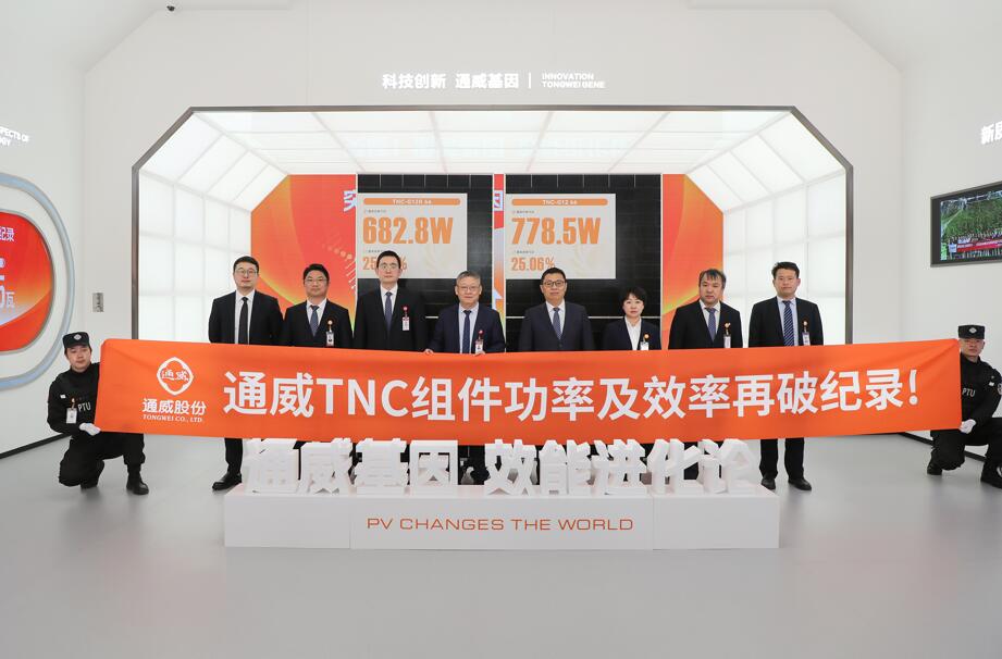 3月20日,通威股份光伏技术中心宣布,经国际权威认证机构TÜV测试,在2382*1134mm标准尺寸下,通威TNC-G12R组件正面功率达到682.8瓦(较目前市场同版型量产主流功率提高约60瓦),转换效率达25.28%;在2384*1303mm标准尺寸下,通威TNC-G12组件功率达到778.5瓦(较目前市场同版型量产主流功率提高约 60瓦),转换效率达25.06%,再次刷新了TOPCon两种主流版型的组件效率和功率纪录。