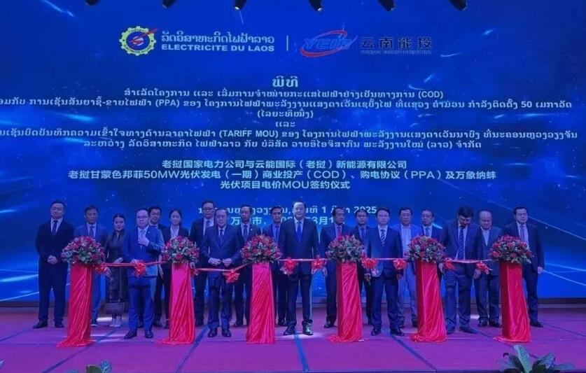 2025年3月1日,中国能建葛洲坝电力公司EPC总承包建设的老挝首个光伏+储能项目——甘蒙色邦菲50MW光伏发电(一期)商业投产仪式在老挝首都万象举行,标志着项目进入实质性运营新阶段。