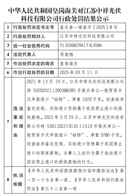 其中对江苏中祥光伏科技有限公司行政处罚结果公示中表示,2021年12月 29日,江苏中祥光伏科技有限公司持532020211200388285号报关单以一般贸易方式申报进口“钴粉”,净重1020千克。