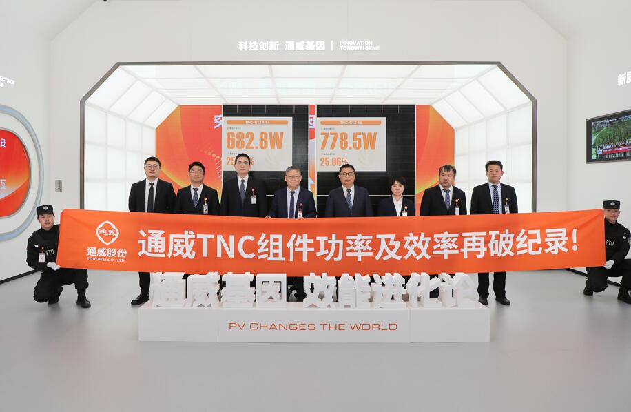 3月20日,通威股份光伏技术中心宣布,经国际权威认证机构TÜV测试,在2382*1134mm标准尺寸下,通威TNC-G12R组件正面功率达到682.8瓦(较目前市场同版型量产主流功率提高约60瓦),转换效率达25.28%;在2384*1303mm标准尺寸下,通威TNC-G12组件功率达到778.5瓦(较目前市场同版型量产主流功率提高约 60瓦),转换效率达25.06%,再次刷新了TOPCon两种主流版型的组件效率和功率纪录。