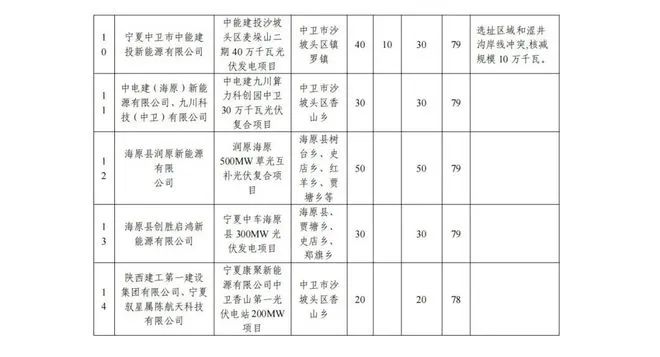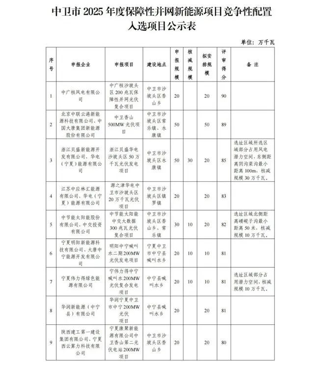 附件:中卫市2025年度保障性并网新能源项目竞争性配置入选项目公示表