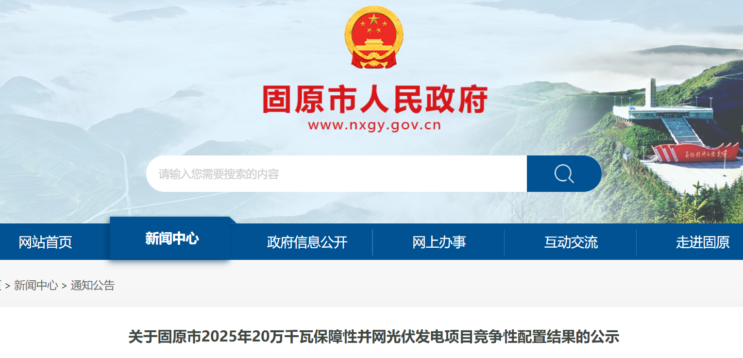 依据《宁夏回族自治区2025年度新能源项目开发建设方案》要求,按照《关于开展固原市2025年保障性并网光伏发电项目竞争性配置的通知》具体规定,固原市发展改革委组织开展了固原市2025年20万千瓦保障性并网光伏发电项目竞争性配置评选工作,经过专家组对申报资料综合评定,现将固原市2025年20万千瓦保障性并网光伏发电项目竞争性配置结果公示如下:一、评审结果固原市2025年20万千瓦保障性并网光伏发电项目的投资主体为华润风电(海原)有限公司。二、公示时间公示期为2025年3月21日至2025年3月25日。三、提交异议情况说明公示期内参与此次竞争性配置企业如对结果有异议的,以书面形式向固原市发展改革委提出。异议文件应有明确的请求和必要的真实证明材料,提交异议文件须在2025年3月25日18时00分前提交至固原市发展和改革委员会。四、联系方式