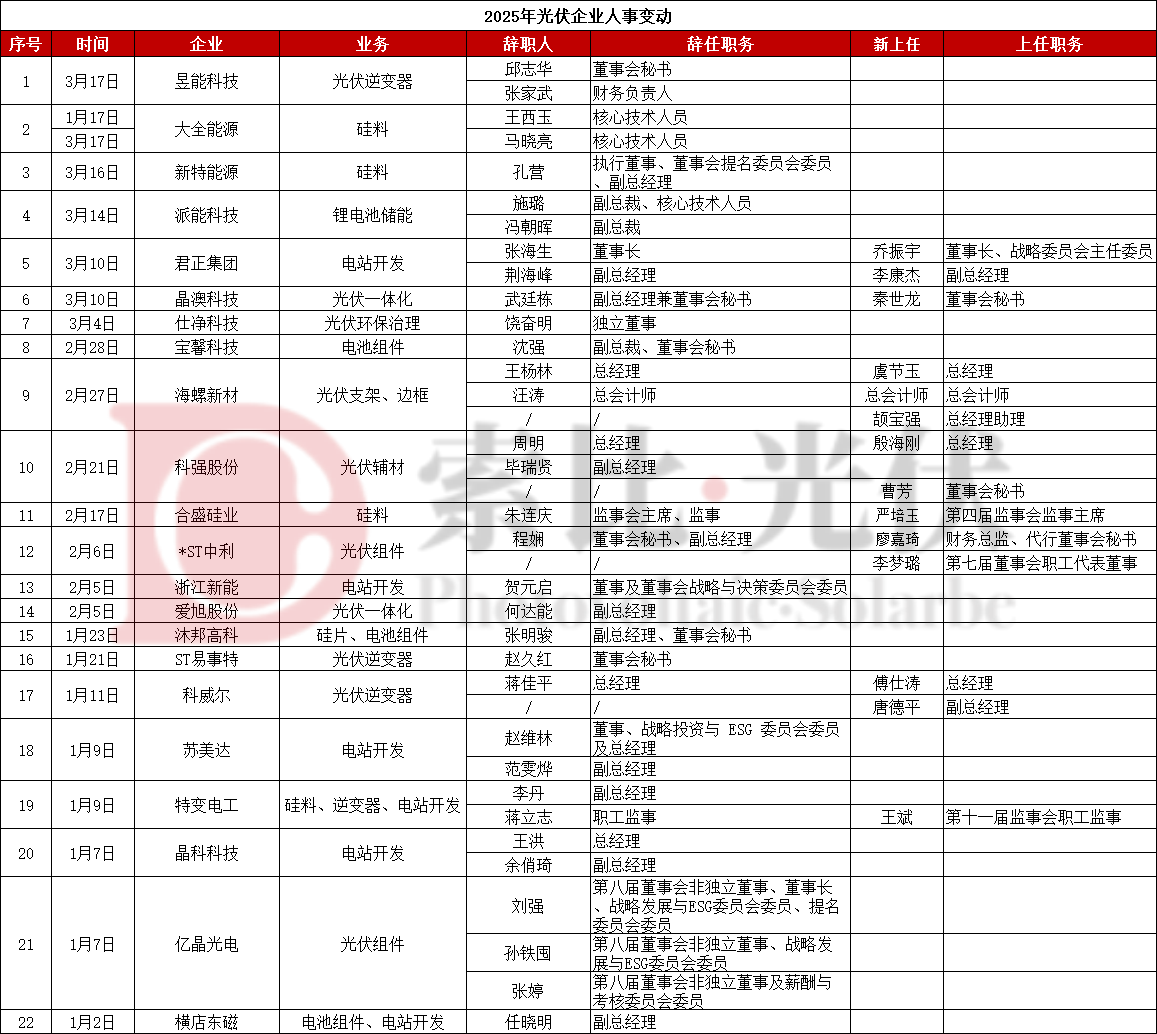 在光伏行业周期波动下,自2025年初以来,光伏行业内发生了多起重要的人事调整事件:大唐集团董事长、党组书记邹磊调任国家能源集团董事长、党组书记,TCL中环原董秘秦世龙任晶澳科技董秘……人事的频繁变动,体现了光伏企业盈利承压,经营压力较大等行业现状。