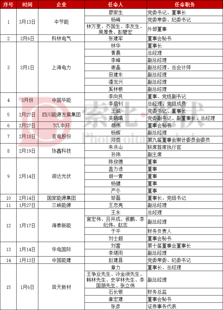 除了上述提及的人事辞职与离任变动外,行业内另有15家企业进行了超过40项的人事任命调整。这些企业涵盖了如中节能、中国华能、国家能源集团、三峡能源、华电国际、中国能建等中央能源企业,同时也包括了科林电气、TCL中环、协鑫科技、润达光伏、海泰新能、回天新材等知名企业。以下是各企业具体的人事任命概况: