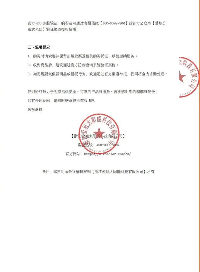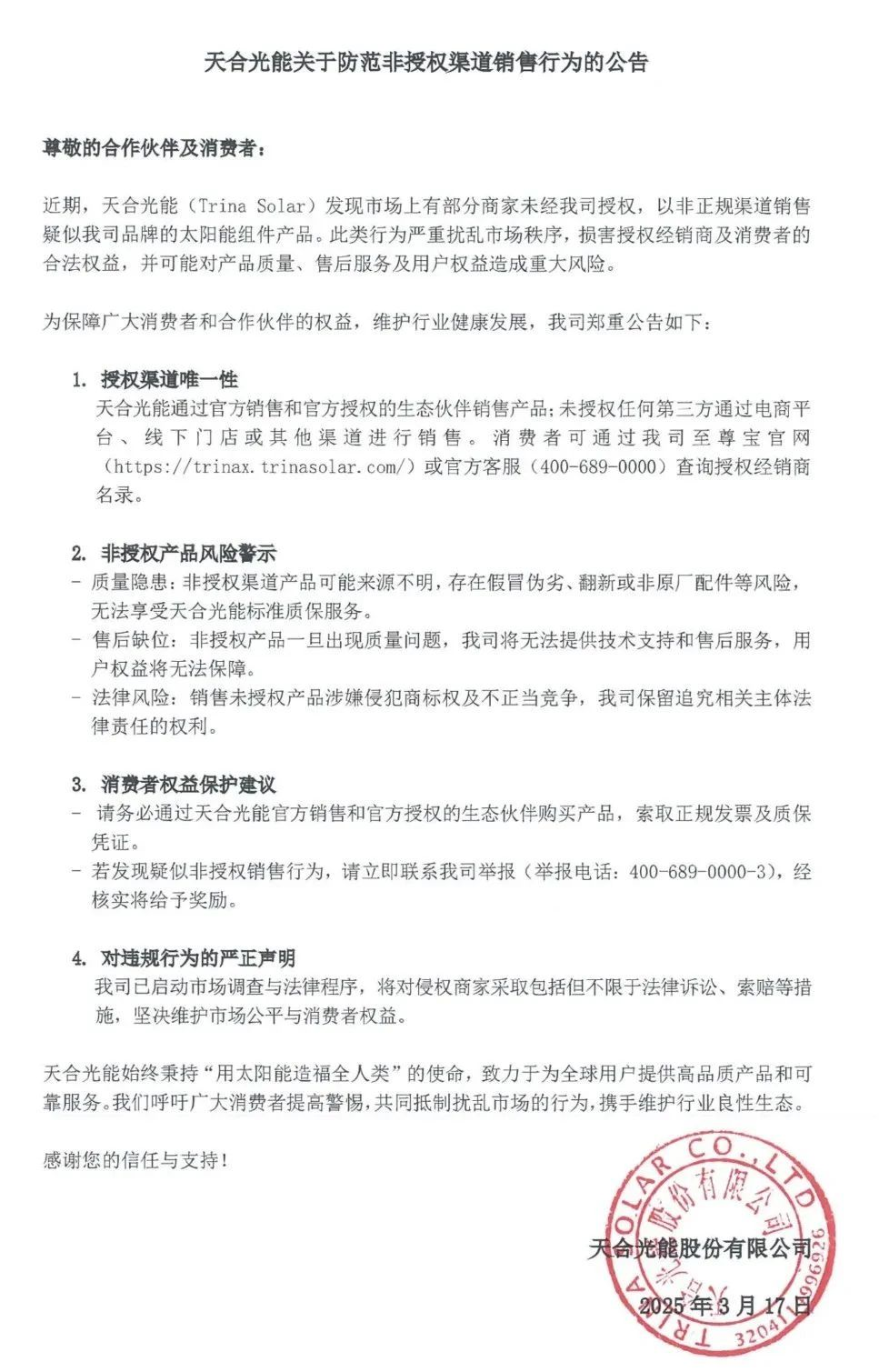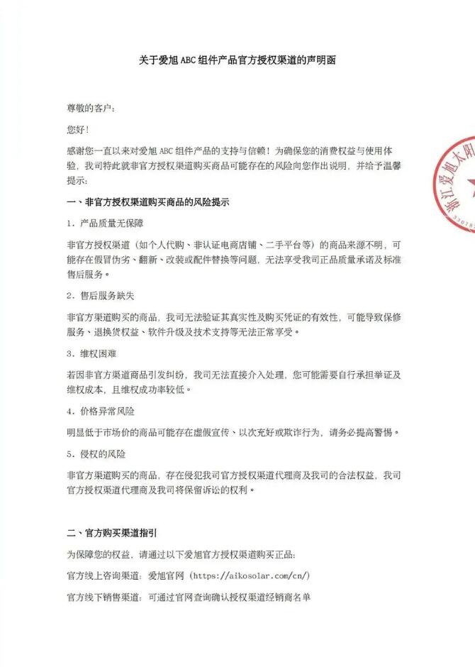 近日,天合光能产品中心和爱旭分布式光伏微信公众号发表声明,提示客户认准官方授权渠道,防范非授权渠道销售。天合光能在公告中表示,发现市场上有部分商家未经公司授权,以非正规渠道销售疑似公司品牌的太阳能组件产品。爱旭股份在声明中提到,就非官方授权渠道购买商品可能存在风险,并提示如发现疑似假冒商品或侵权行为,欢迎通过官方渠道举报。