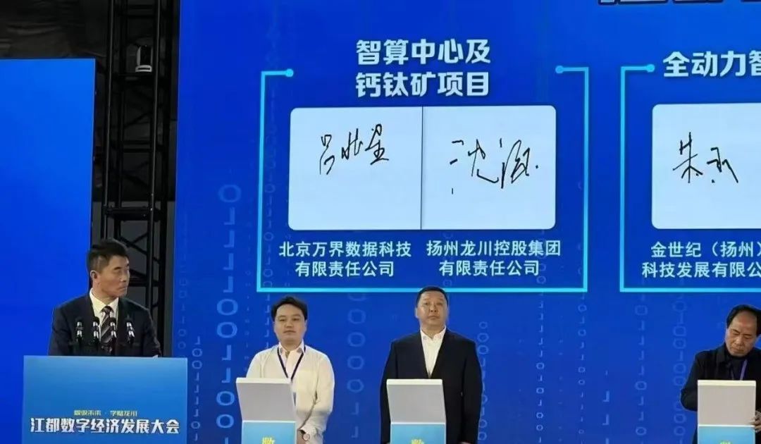 据悉,智算中心及钙钛矿项目由北京万界数据科技有限责任公司(以下简称“万界数据”)与江都区政府及扬州龙川控股集团有限责任公司(以下简称“龙川控股”)合作,致力于构建以数据为驱动力的产业发展模式。此次合作将充分利用万界数据在智算中心、人工智能等技术领域的优势,为江都区数字经济的发展注入新动力,助力区域产业的升级换代。