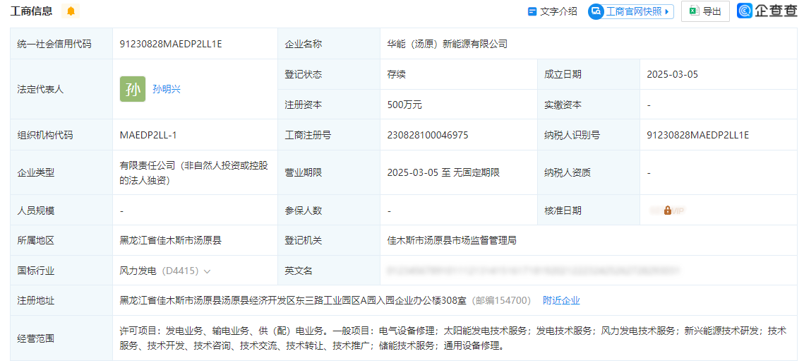 企查查APP显示,近日,华能(汤原)新能源有限公司成立,法定代表人为孙明兴,注册资本500万元,经营范围包含:发电业务、输电业务、供(配)电业务;电气设备修理;太阳能发电技术服务;发电技术服务;风力发电技术服务;新兴能源技术研发等。企查查股权穿透显示,该公司由华能(哈尔滨)能源开发有限公司全资持股,后者由华能黑龙江发电有限公司、中国一重共同持股。
