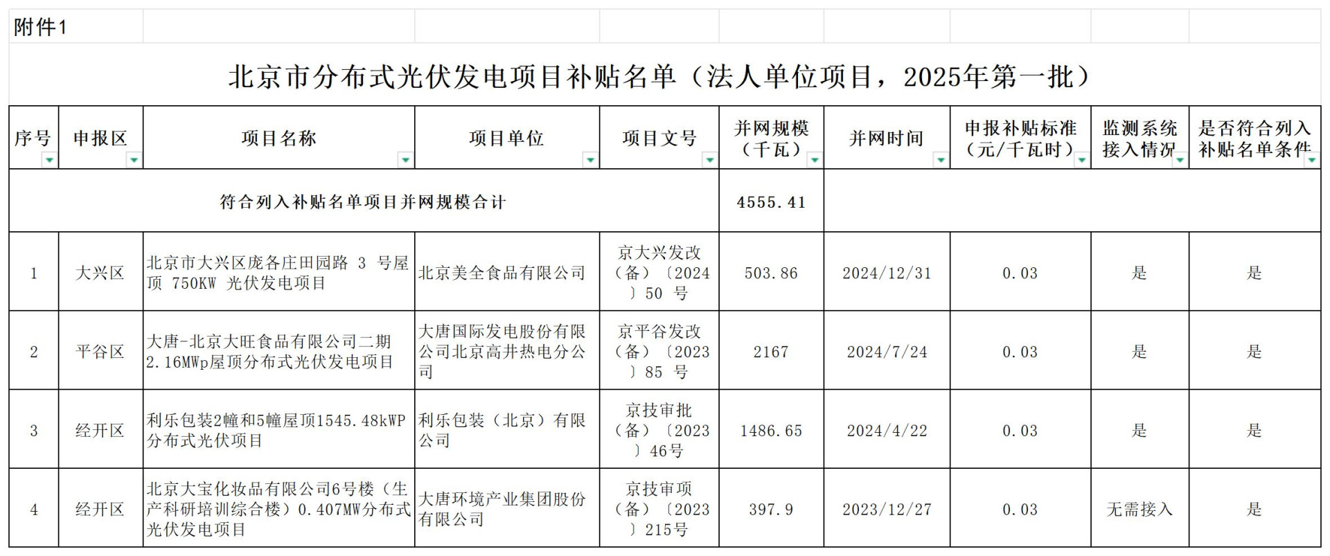 附件:1.北京市分布式光伏发电项目补贴名单(法人单位项目,2025年第一批)