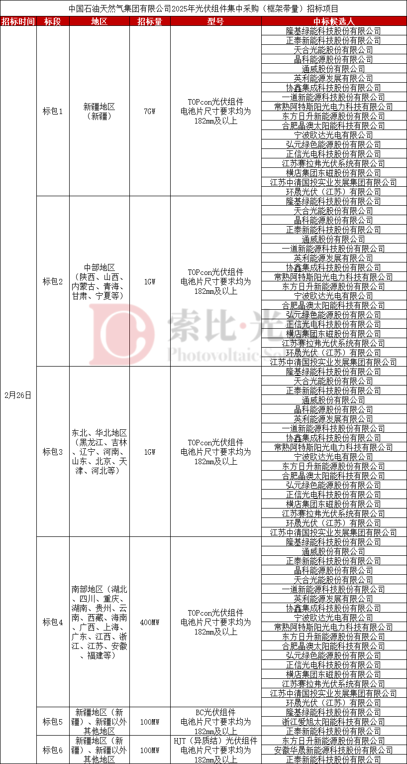 3月21日,中国石油天然气集团有限公司2025年光伏组件集中采购(框架带量)招标中标候选人公示。本项目为6个标包,集采容量9.6GW,要求光伏组件须在合同签订后45天内交货。