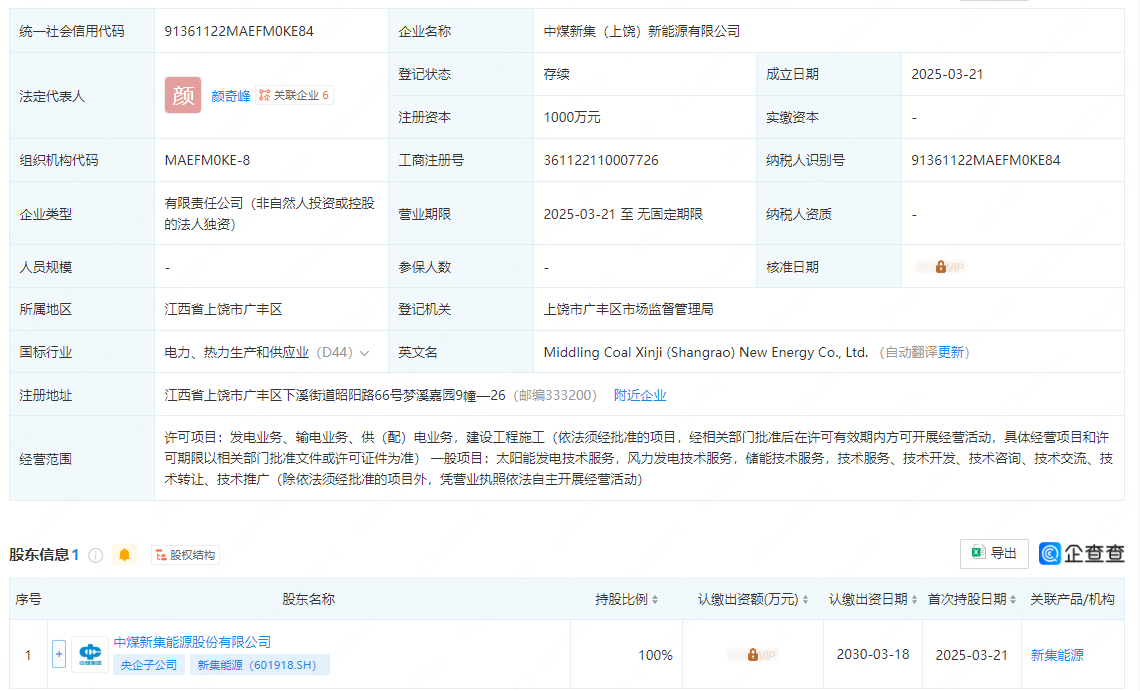 企查查APP显示,近日,中煤新集(上饶)新能源有限公司成立,法定代表人为颜奇峰,注册资本1000万元,经营范围包含:太阳能发电技术服务,风力发电技术服务,储能技术服务等。企查查股权穿透显示,该公司由新集能源全资持股。