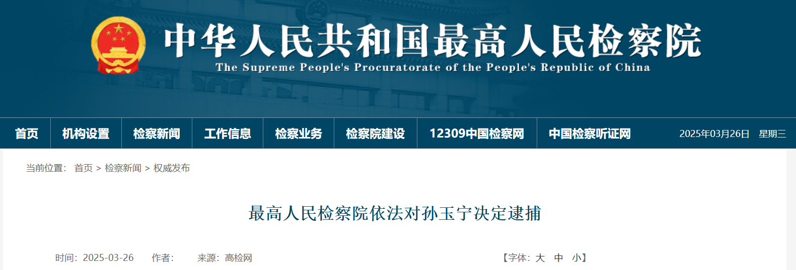 海关总署原党委委员、副署长孙玉宁涉嫌受贿一案,由国家监察委员会调查终结,移送检察机关审查起诉。日前,最高人民检察院依法以涉嫌受贿罪对孙玉宁作出逮捕决定。该案正在进一步办理中。