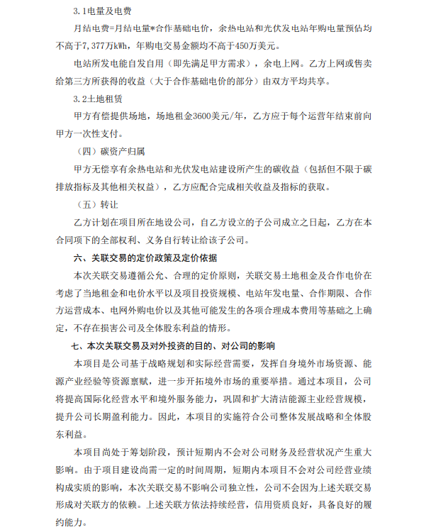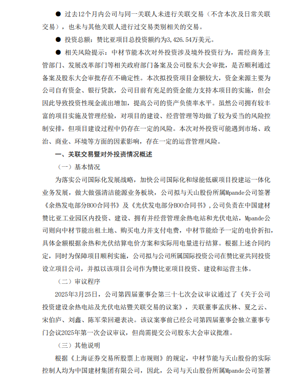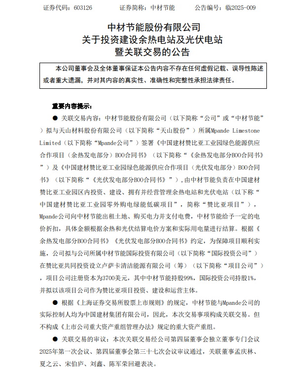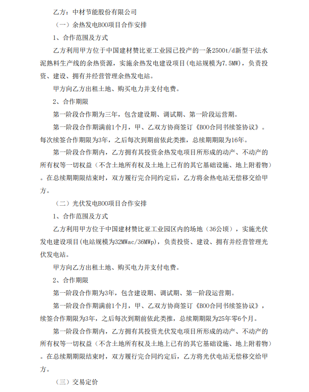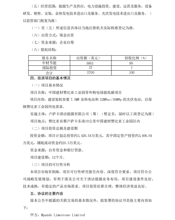 为落实公司国际化发展战略,加快公司国际化和绿能低碳项目投建运一体化业务发展,做大做强清洁能源业务板块,中材节能股份有限公司拟与天山材料股份有限公司所属Mpande LimestoneLimited签署《中国建材赞比亚工业园绿色能源供应合作项目(余热发电部分)BOO合同书》及《中国建材赞比亚工业园绿色能源供应合作项目(光伏发电部分)BOO合同书》。