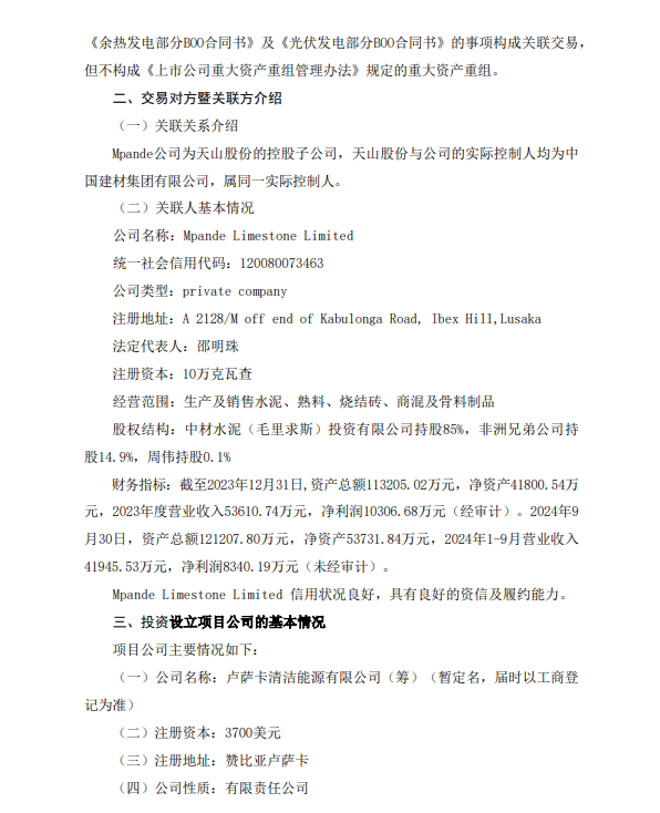 据悉,Mpande公司为天山股份的控股子公司,天山股份与公司的实际控制人均为中国建材集团有限公司,属同一实际控制人。