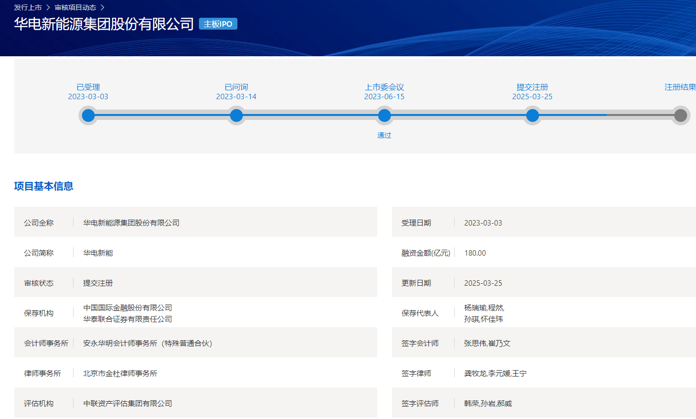 2025年3月25日,上海证券交易所官方网站显示,华电新能源集团股份有限公司(简称:华电新能)已正式提交首次公开发行(IPO)注册申请。此次IPO由中国国际金融股份有限公司和华泰联合证券有限责任公司联合保荐,安永华明会计师事务所担任审计机构,北京市金杜律师事务所提供法律服务。