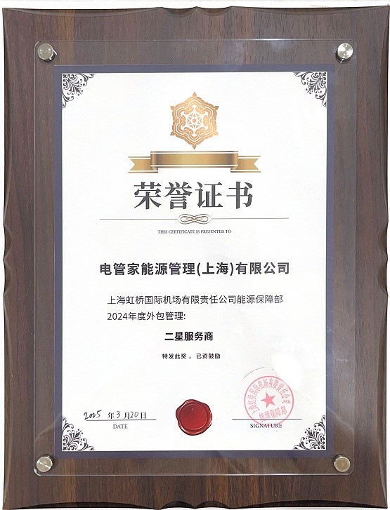 会上,电管家集团股份有限公司(以下简称:电管家集团)旗下子公司电管家能源管理(上海)有限公司,凭借卓越的服务表现和专业的运维管理能力,在众多外包服务商中脱颖而出,成为“唯一”一家荣获星级殊荣的外包服务商,被授予“二星服务商”称号!这是对电管家集团连续六年为虹桥机场提供高质量能源保障服务的充分肯定,也标志着双方合作迈入新阶段。