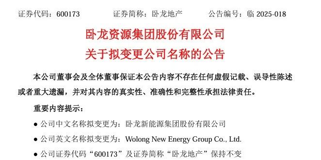近日,卧龙资源集团股份有限公司(以下简称“卧龙地产”)发布公告称,3月25日,公司召开第十届董事会第七次会议,审议通过《关于变更公司名称的议案》,同意公司拟将名称变更为“卧龙新能源集团股份有限公司”(英文名称:Wolong New Energy Group Co.,Ltd.)。
