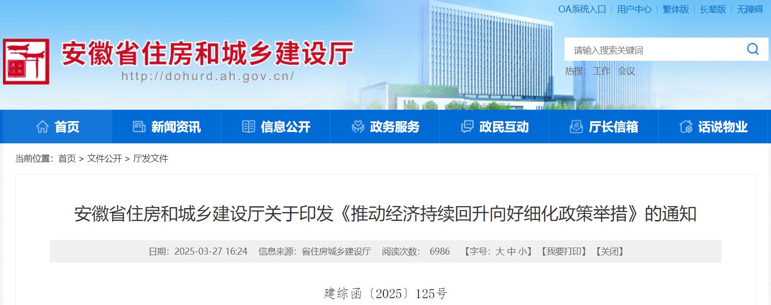 为贯彻落实《安徽省人民政府印发〈关于推动经济持续回升向好若干政策举措〉的通知》(皖政〔2025〕14号)要求,稳定预期、激发活力,推动经济持续回升向好,现结合住房城乡建设领域实际,提出以下细化政策举措。