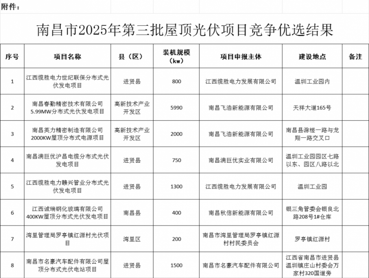 南昌市发展改革委关于公布列入南昌市2025年第三批屋顶光伏项目竞争优选结果的通知