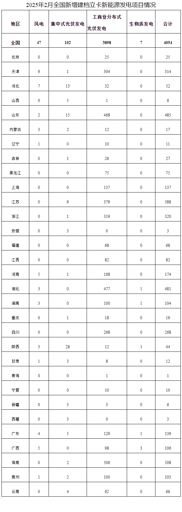 2025年2月,全国新增建档立卡新能源发电(不含户用光伏)项目共4054个,其中风电项目47个,光伏发电项目4000个(集中式光伏发电项目102个,工商业分布式光伏发电项目3898个),生物质发电项目7个。