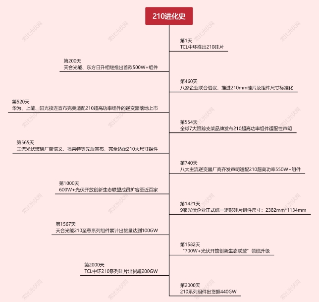 2020年1月22日,天合光能首片210组件正式下线,行业创新的潘多拉魔盒正式开启。在210组件技术得到市场验证后,逆变器、跟踪支架、接线盒等各个环节纷纷都以超速度适配210,210生态圈焕然一新。在各方协同创新下,210技术完全成熟的标志,是在2021年2月1日,中环股份发布公告称将建设第二个210工厂——宁夏银川50GW(G12)单晶硅材料智能工厂及配套产业,总投资额120亿元。
