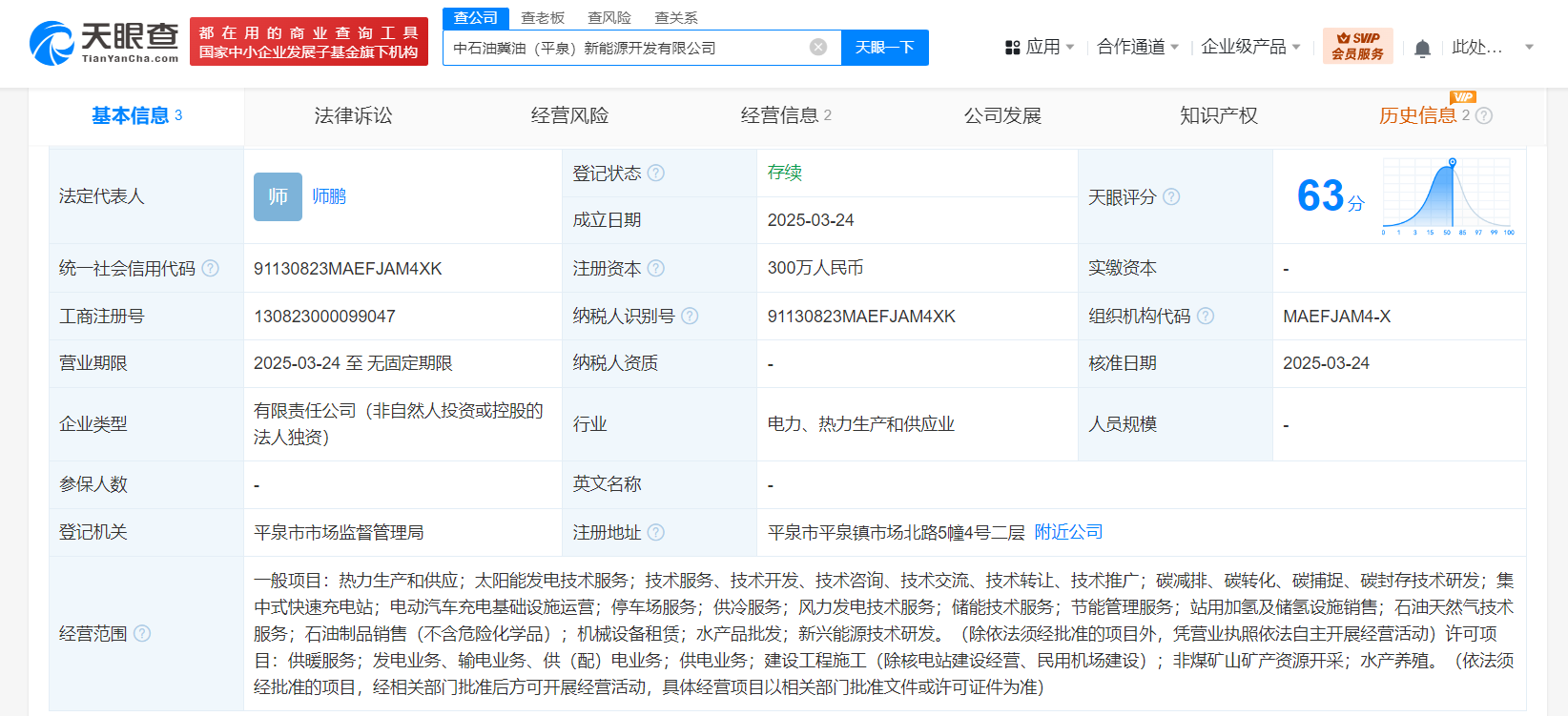 天眼查App显示,近日,中石油冀油(平泉)新能源开发有限公司成立,法定代表人为师鹏,注册资本300万人民币。