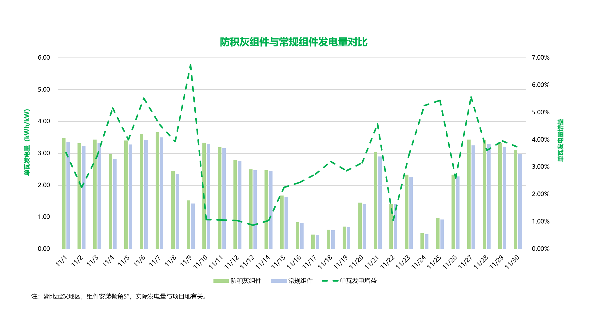 武汉项目数据显示,相较于常规组件正泰新能高效防积灰组件日均发电增益达3.33%,最高单日增益突破6.74%,充分证实防积灰组件较常规边框组件具有更优的发电增益。