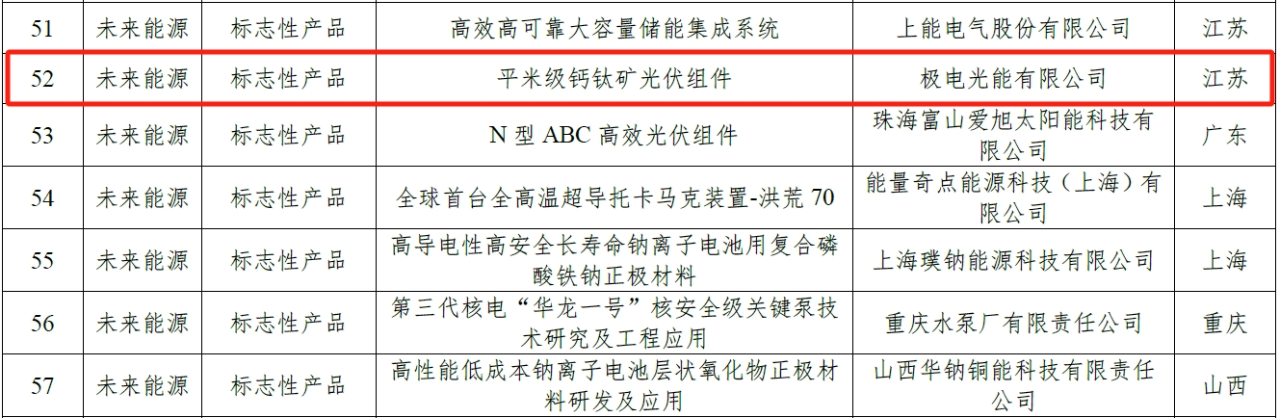 在榜单披露的67项“标志性产品”中,极电光能“平米级钙钛矿光伏组件” 与宇树科技“人形机器人”、阿里云“通义灵码”等行业前瞻产品共同上榜。作为光伏领域唯二、钙钛矿行业唯一入选代表,成功跻身“未来能源”方向11席之列。