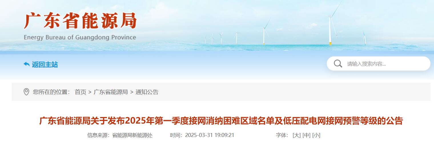 广东省能源局关于发布2025年第一季度接网消纳困难区域名单及低压配电网接网预警等级的公告