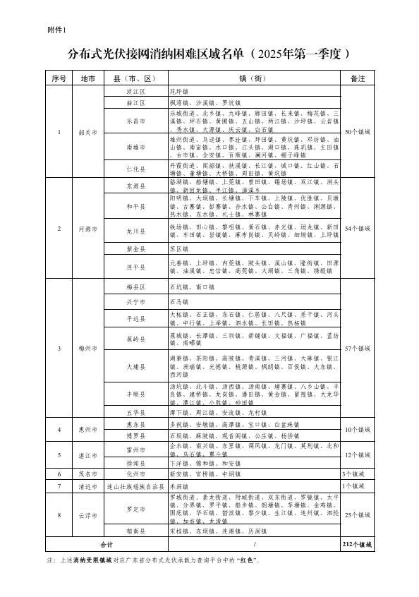 日前,广东省能源局关于发布2025年第一季度接网消纳困难区域名单及低压配电网接网预警等级的公告,公告显示,消纳受限区域主要涉及韶关、河源、梅州、惠州、湛江、茂名、清远和云浮等8个地市25个县(市、区)212个镇(街)。