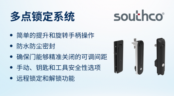 在储能行业中,对于设备的IP防护要求通常在IP54以上。然而,随着储能设备的大型化发展,传统的IP54防护标准已逐渐难以满足实际需求。在此背景下,行业主流企业普遍选择提升防护等级,以应对大型化储能柜的更高防护要求。值得一提的是,索斯科的多点锁定系统具备出色的防护性能,其IP防护等级普遍达到IP65或以上。索斯科的多点锁定系统是一种通过多个锁点来固定和保护机柜设备的安全系统,通常由多个锁定点、锁芯和控制组件组成,可应用于储能机柜上。多点锁系统的防护能力比传统的单点锁更强大,高防护性的多点锁可以确保机柜门在关闭时紧密密封,单个手柄驱动大门上的多个锁点,方便为较大的储能设备提供稳固锁定,为储能设备的安全稳定运行提供了有力保障。