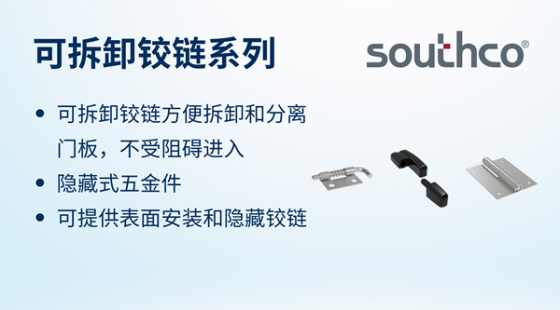 除了安全可靠的锁定解决方案外,设计人员还需要考虑其他关键附件,如铰链,以进一步增强设备的安全性、密封性和功能性。对于储能行业来说,合适的铰链解决方案对于确保门的安全固定至关重要。作为行业领先的供应商,索斯科提供多种可拆卸和隐藏式铰链产品,以满足储能行业的多样化需求。这些铰链具有出色的强度、刚度和耐腐蚀性,能够确保在储能设备使用过程中的精度和平衡。