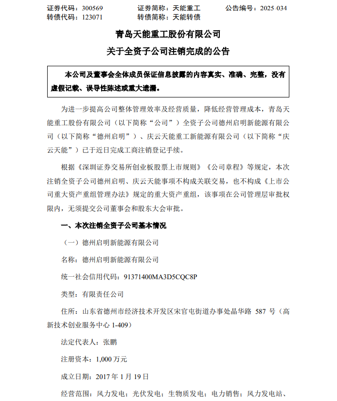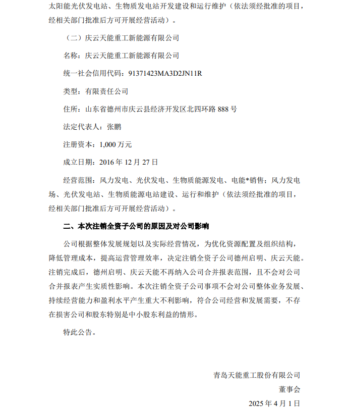 4月2日,天能重工发布关于全资子公司注销完成的公告。