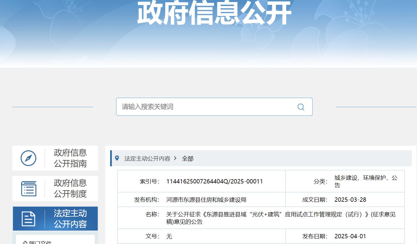 4月1日,广东省东源县住房和城乡建设局发布公告,就《东源县推进县域“光伏+建筑”应用试点工作管理规定(试行)》公开征求意见。