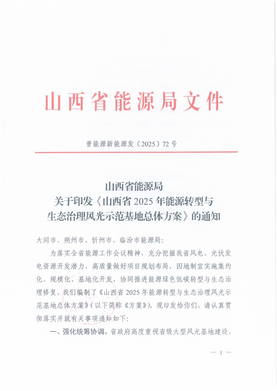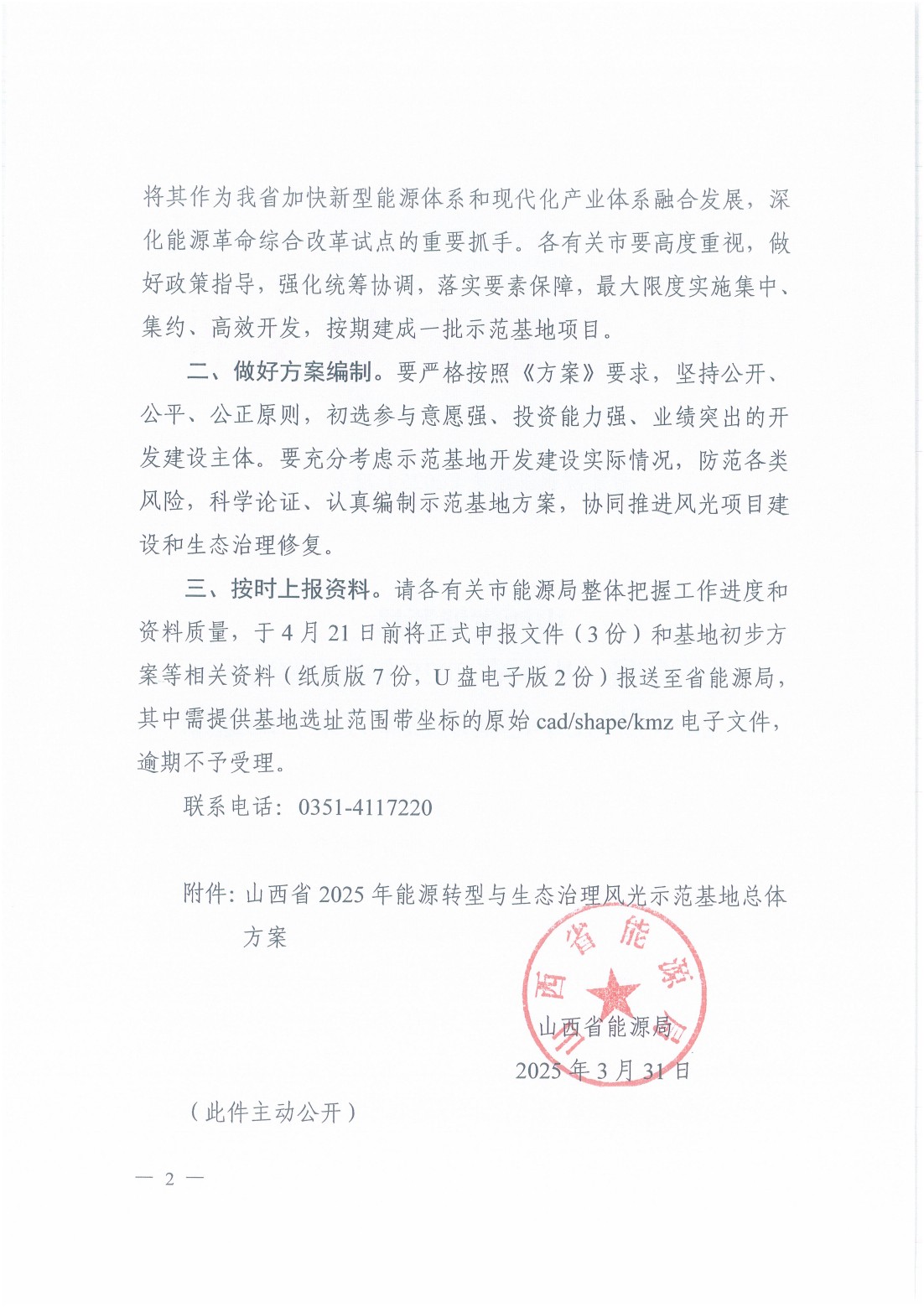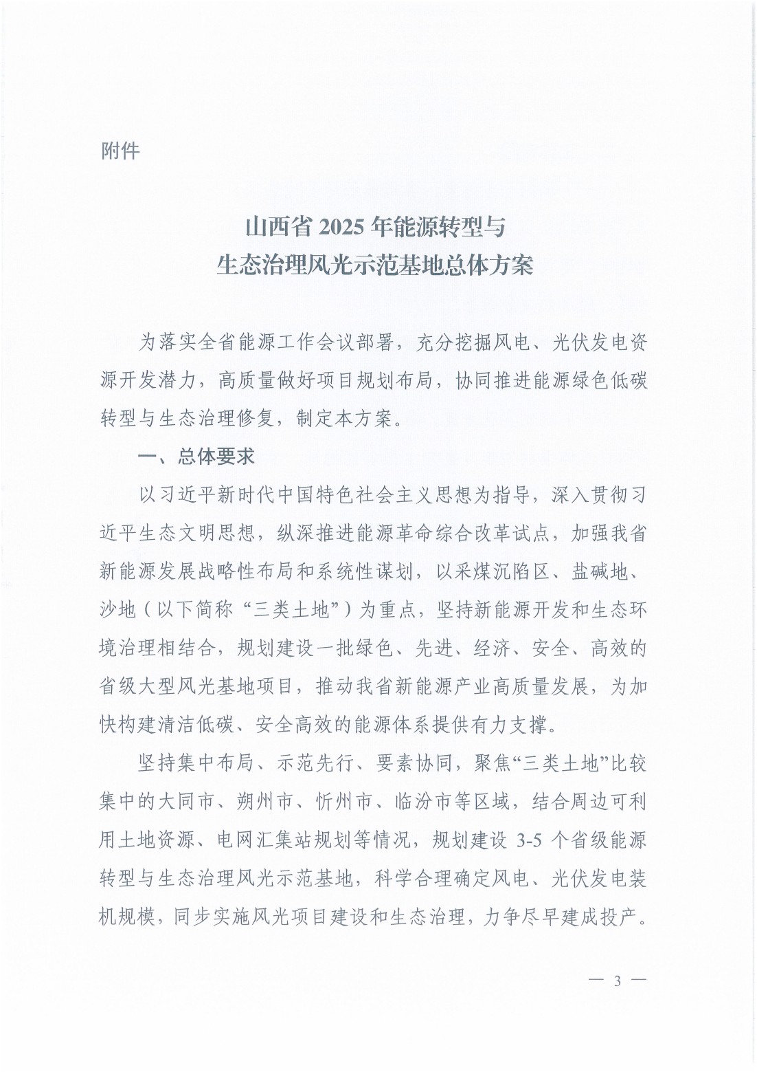 3月31日,山西能源局印发《山西省2025年能源转型与生态治理风光示范基地总体方案》(简称“方案”)。