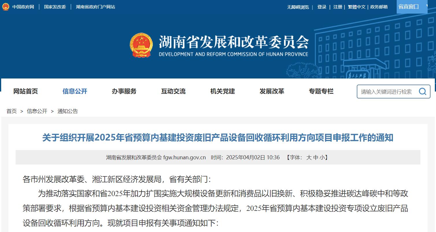 近日,湖南省发展和改革委员会发布关于组织开展2025年省预算内基建投资废旧产品设备回收循环利用方向项目申报工作的通知。通知指出,支持废旧动力电池拆解和规范化梯次利用,退役风电光伏设备回收利用。