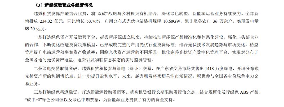 越秀租赁全年实现营业收入59.89亿元(+39%),净利润16.32亿元(+17.74%),新增投放聚焦民生工程、新能源与普惠租赁领域,其中新能源业务投放占比达48.46%。越秀新能源作为2022年成立的绿色资产开发平台,首年即爆发式增长:营收27.34亿元(+673.09%),净利润6.08亿元(+1279.08%),全年新增户用光伏装机10.60GW,发电量89.20亿度,服务农户36万户。
