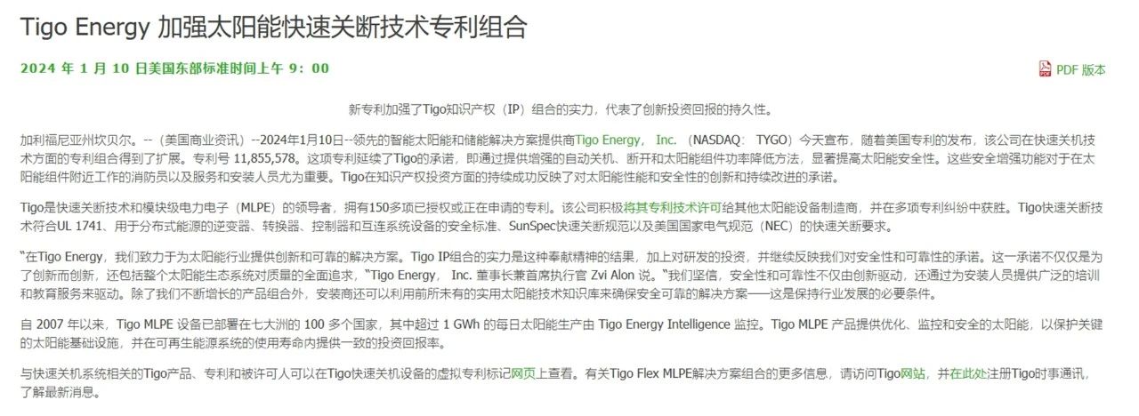 2024年8月21日,全球太阳能行业迎来了一场备受瞩目的专利较量。总部位于美国硅谷的纳斯达克上市公司Tigo Energy, Inc.,(迭戈能源有限公司,股票代码:TYGO.US,以下简称“Tigo”),Tigo发布上市公司通告:其中国子公司特歌能源设备贸易(苏州)有限公司,向上海知识产权法院对浙江奔一新能源有限公司(以下简称“奔一公司”)提起专利侵权诉讼(案号:(2024)沪73知民初177号),指控奔一公司侵犯了其快速关断技术专利(中国专利号ZL200880114564.0)。该专利涉及一种用于光伏面板系统的快速关断模组,其通过接收远程单元发射的周期性信号来控制开关,从而在对光伏面板进行指定操作时(例如安装光伏面板时)能够方便控制光伏面板与系统之间的链接,以防止光伏面板产生高电压危害到施工人员和光伏面板系统中的其他电路元器件的安全。