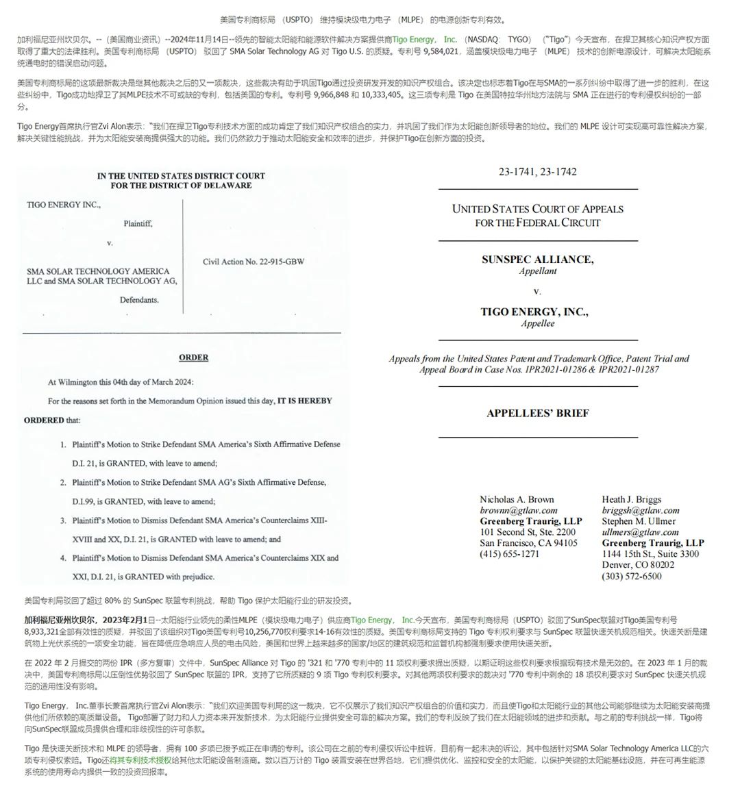 Tigo与Sunspec联盟的专利诉讼案件在美国专利局经历了重要裁决。美国专利局完全驳回了Sunspec联盟对Tigo美国专利有效性提出的质疑。目前,特歌与Sunspec联盟的专利诉讼案件仍在进行中。