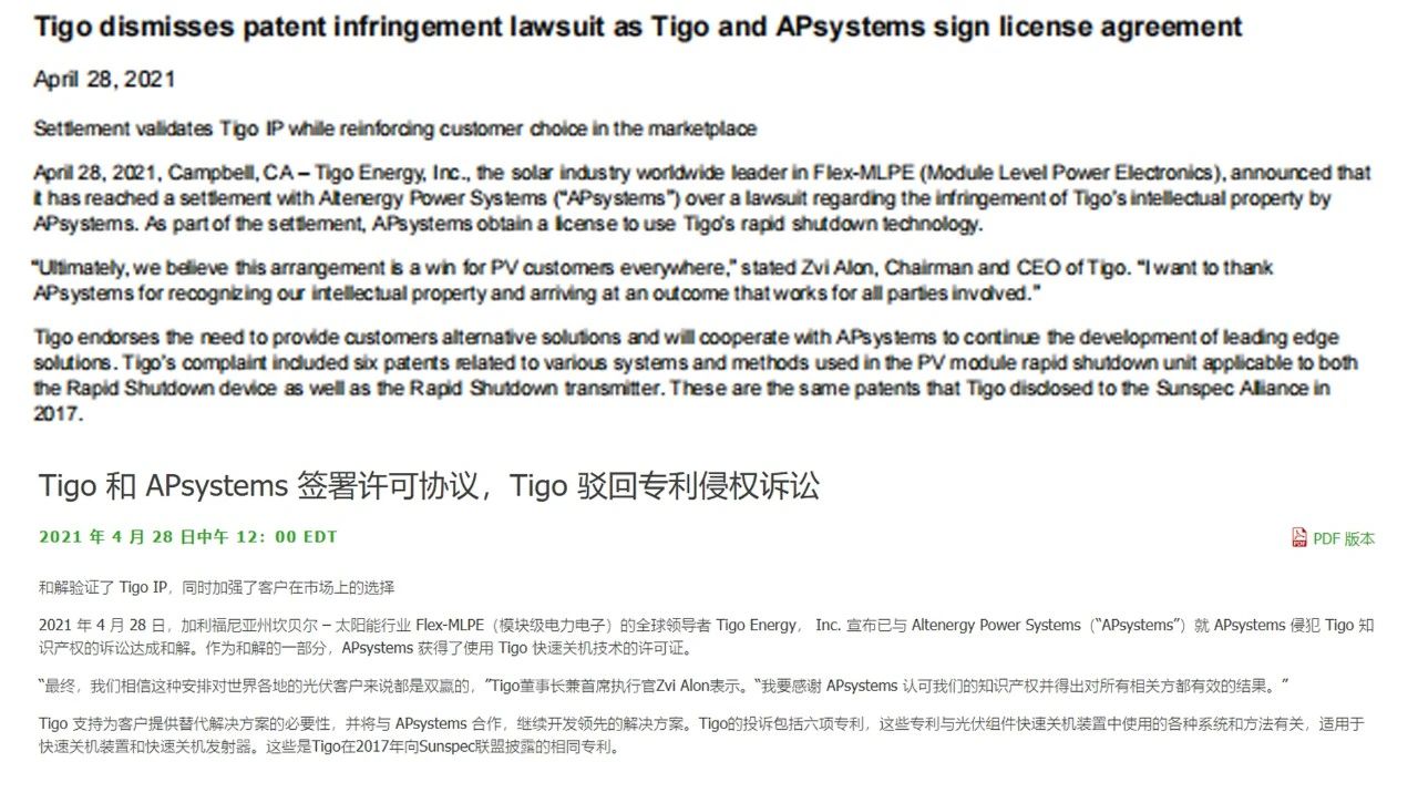 Tigo与中国科创板上市企业APsystems(昱能科技,股票代码:688348.SH)之间的知识产权诉讼最终达成了和解。作为和解协议的一部分,APsystems通过支付专利授权费的方式获得了使用Tigo快速关断技术的许可。
